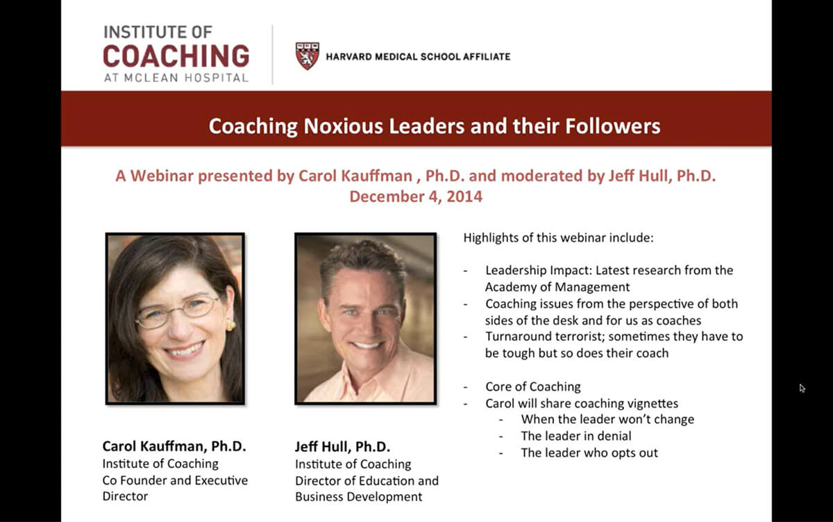 In this webinar hosted by the Institute of Coaching, founder Carol Kauffman and director Jeff Hull discuss the latest research on leadership impact, coaching issues currently faced on both sides of the desk, how to identify when a leader won’t change, when denial is present and identifying a leader who opts out.