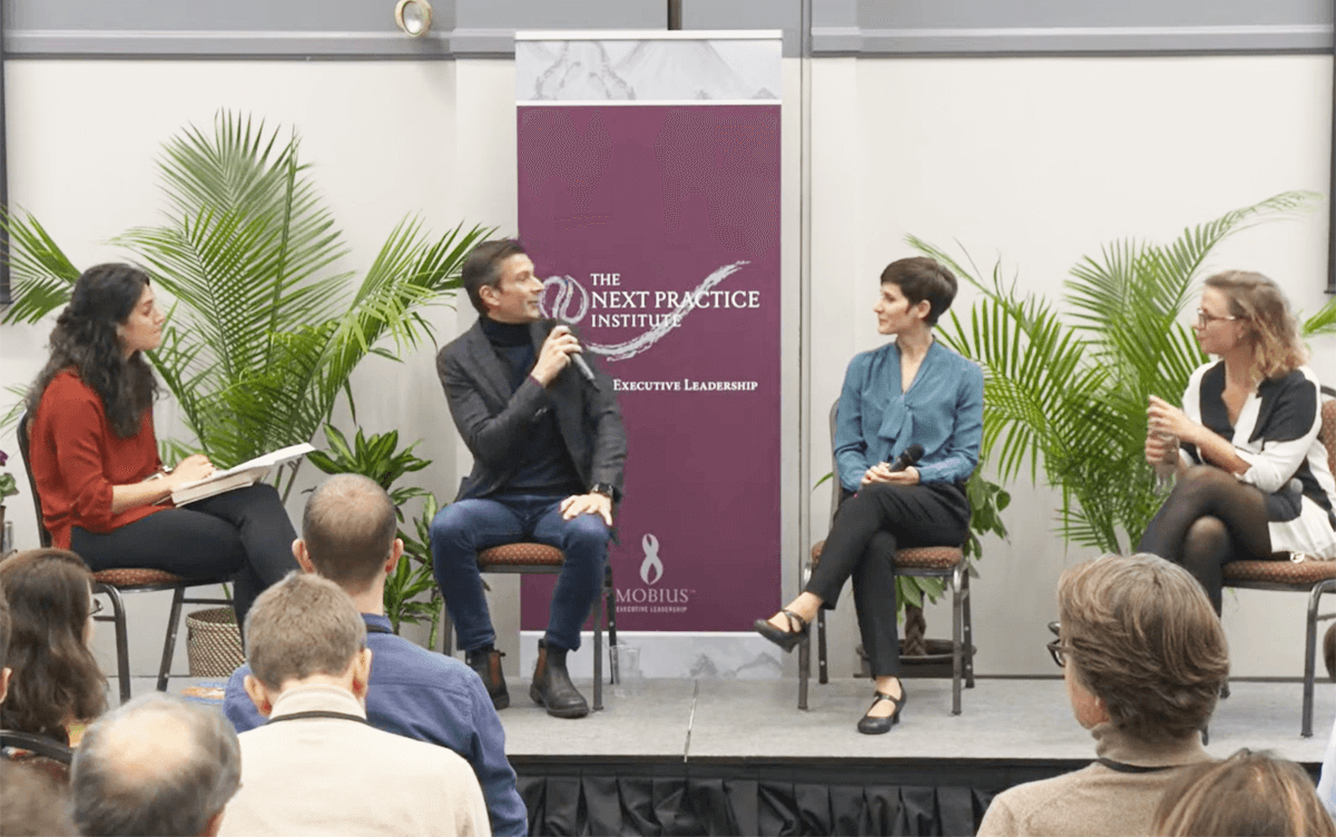 Stefano Petti of Asterys, Betinna Rollow, co-author of New Work Takes (check word) Inner Work and Nadja Taranzweski co-founder of Conscious U and author of XXX in conversation with organizational culture expert Golbie Kamarie in a panel at the 2019 annual gathering of the Next Practice Institute.
